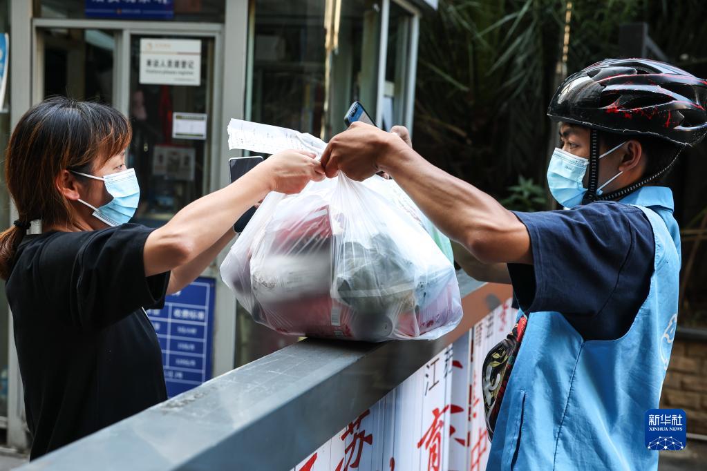 9月7日,配送員(右)為市民配送生活物資。新華社記者 歐東衢 攝