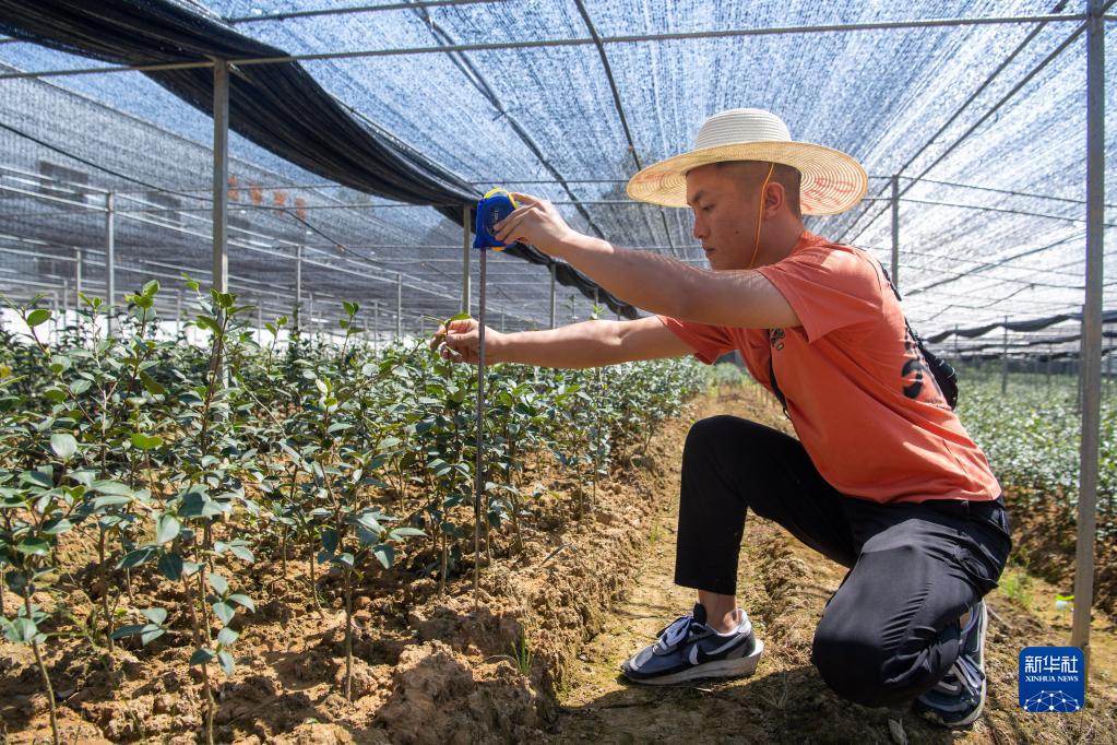 9月6日,在位于重慶市酉陽縣泔溪鎮的油茶育苗基地,科研人員在記錄油茶生長數據。這一基地自建成以來帶動村民穩定就業,增收致富。新華社記者 唐奕 攝