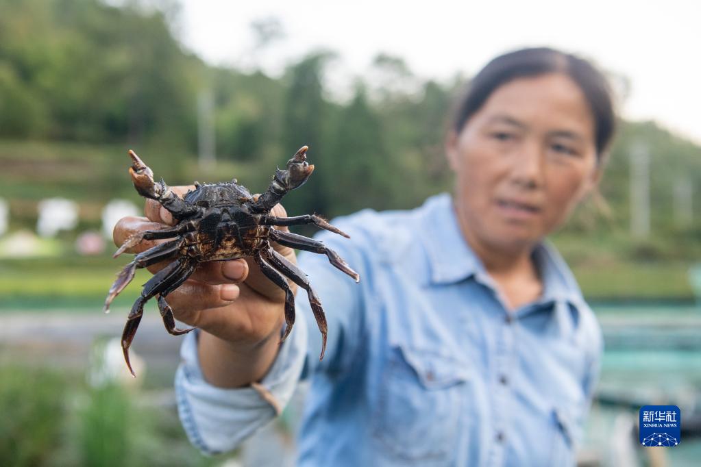 9月6日,在重慶市酉陽縣黑水鎮大涵村“稻田養蟹產業園”,工作人員展示捕撈的螃蟹。這個產業園采取“村集體經濟組織+企業+農戶”的發展模式,堅持“稻蟹共生、村民共富”,惠及農戶增收致富。新華社記者 唐奕 攝