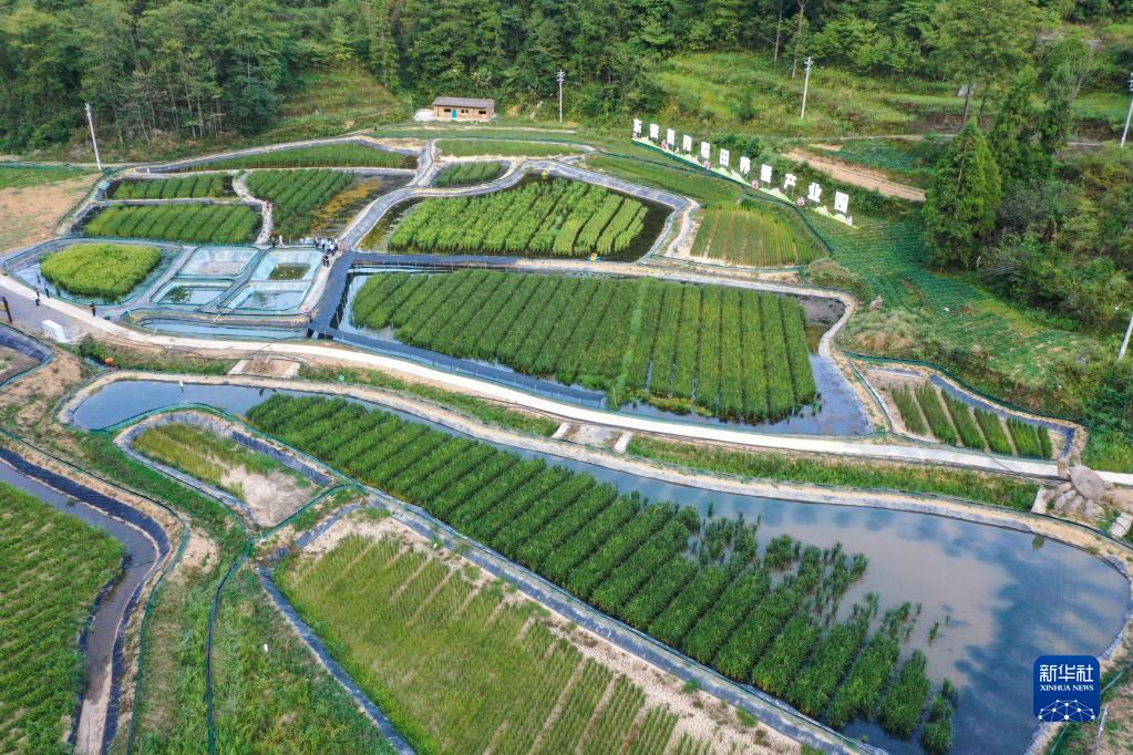這是9月6日拍攝的重慶市酉陽縣黑水鎮大涵村“稻田養蟹產業園”(無人機照片)。新華社記者 唐奕 攝