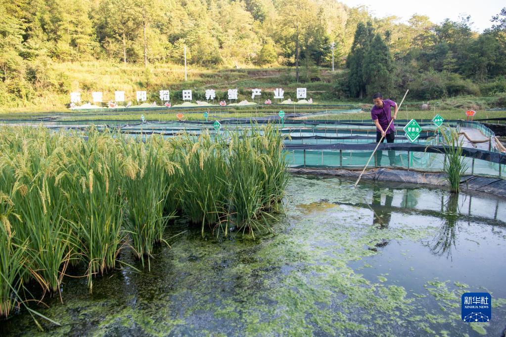 9月6日,重慶市酉陽縣黑水鎮大涵村“稻田養蟹產業園”的工作人員在捕撈螃蟹。新華社記者 唐奕 攝