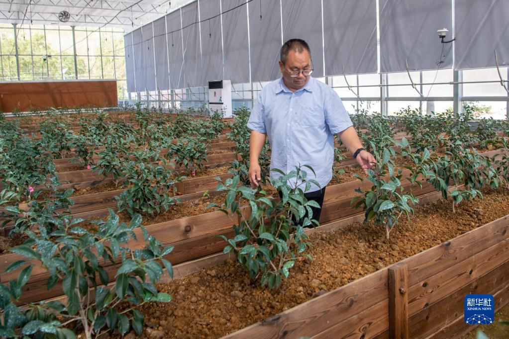 9月6日,在位于重慶市酉陽縣泔溪鎮的油茶育苗基地,工作人員查看油茶生長情況。這一基地自建成以來帶動村民穩定就業,增收致富。新華社記者 唐奕 攝