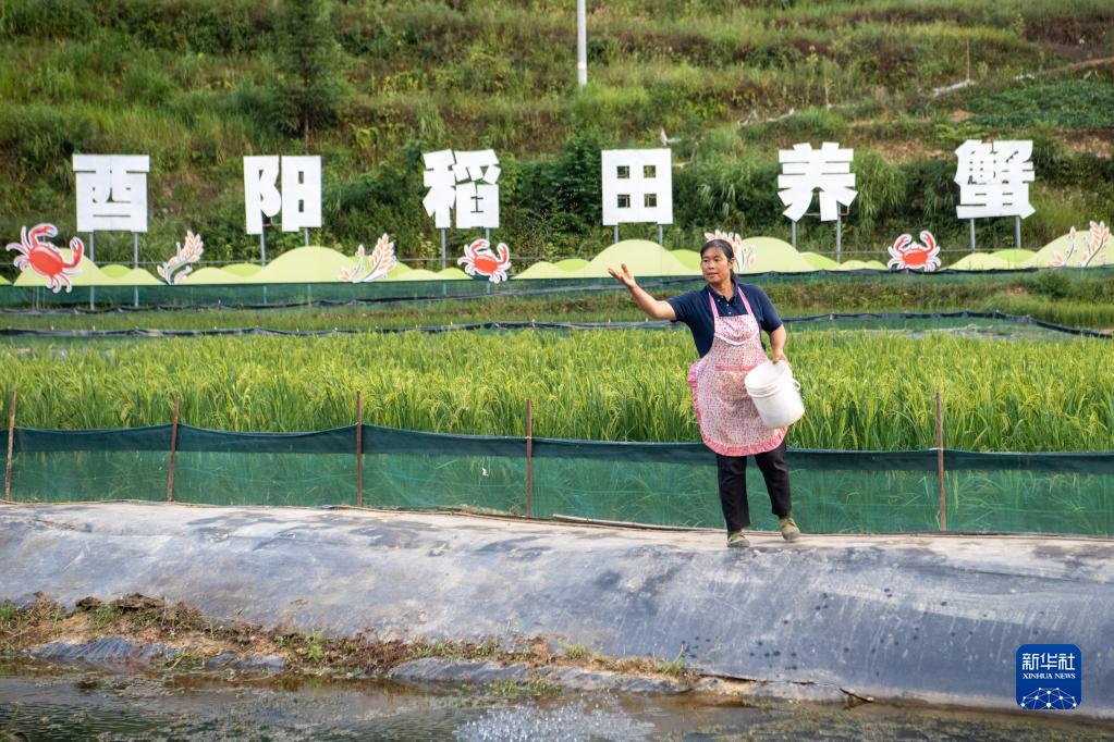 9月6日,在重慶市酉陽縣黑水鎮大涵村“稻田養蟹產業園”,工作人員在拋灑飼料。新華社記者 唐奕 攝