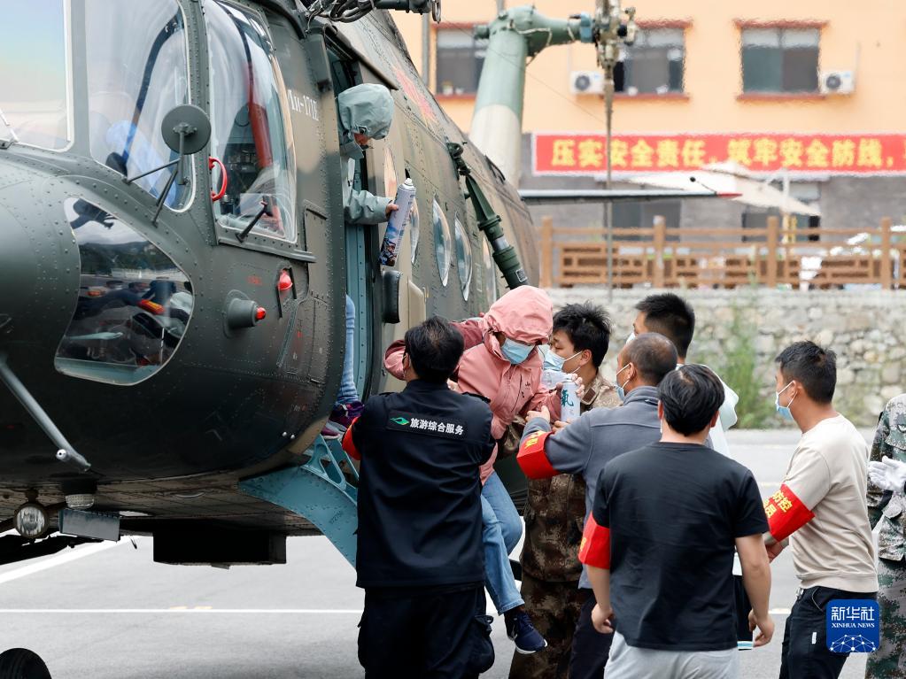 9月7日,首批從海螺溝搭乘直升機疏散出來的滯留人員抵達瀘定縣磨西鎮。新華社記者 沈伯韓 攝