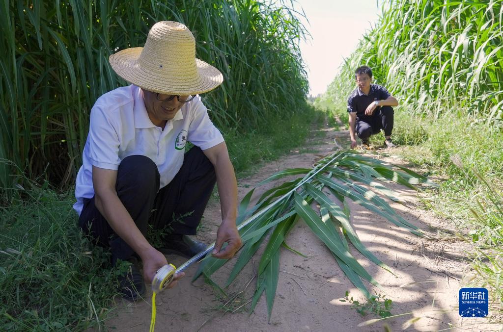 9月6日,在寧夏靈武市郝家橋鎮團結村,技術人員(左)在測量巨菌草的生長數據。