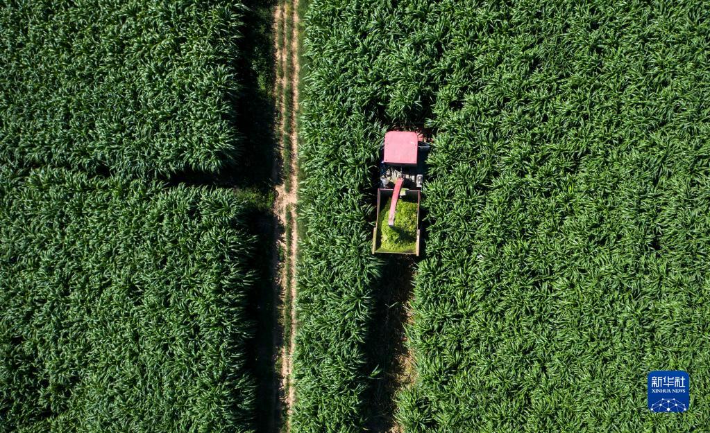 這是9月6日在寧夏靈武市郝家橋鎮團結村拍攝的巨菌草收割現場(無人機照片)。