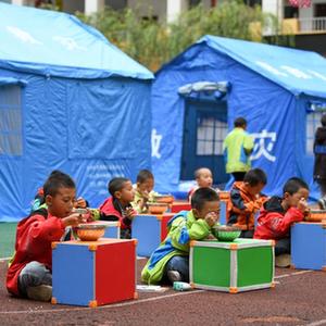 9月7日,學生們在石棉縣草科鄉中心小學內吃午飯。
