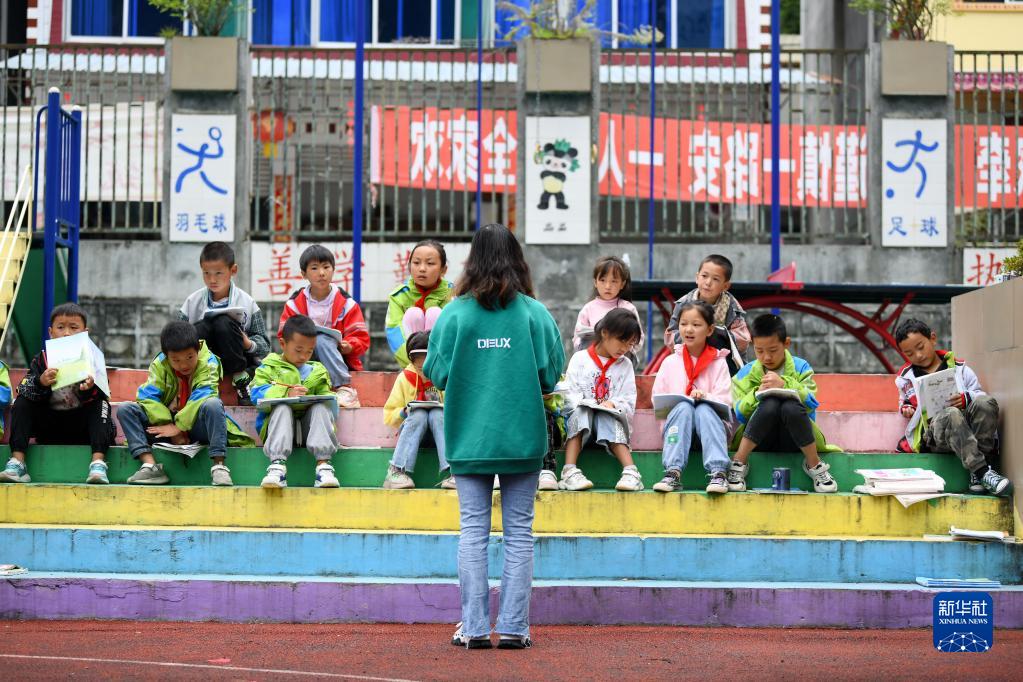 9月7日,在石棉縣草科鄉中心小學操場上,老師在給三年級學生上課。