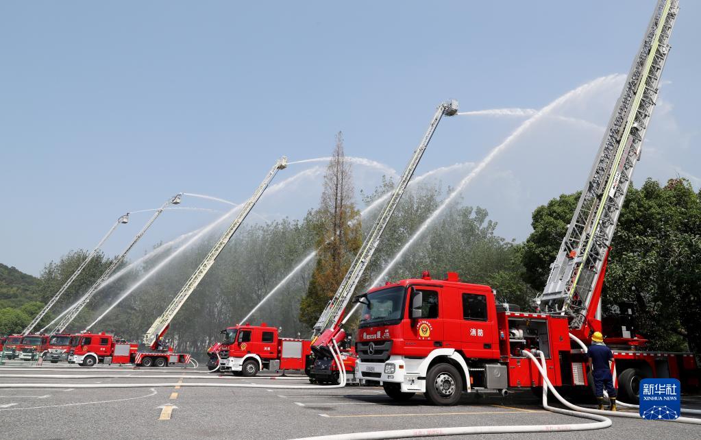 9月7日,云梯消防車在演練火場外圍噴水設置防止火情蔓延的水幕隔離帶。