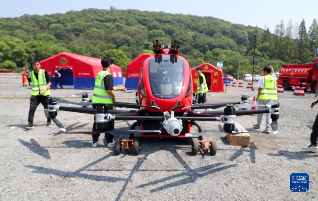 9月7日,一架裝備滅火裝置的無人機在演練現場進行展示。
