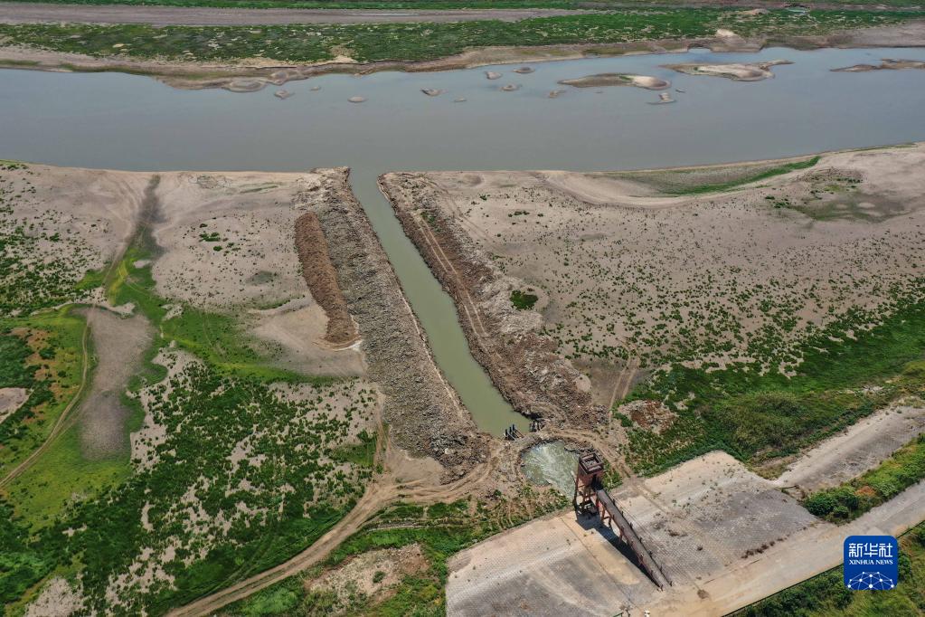 這是鄱陽湖畔南昌市高新區鯉魚洲管理處一個電排站。為了取水,當地組織挖掘水渠深入到湖區更深處(9月7日攝,無人機照片)。