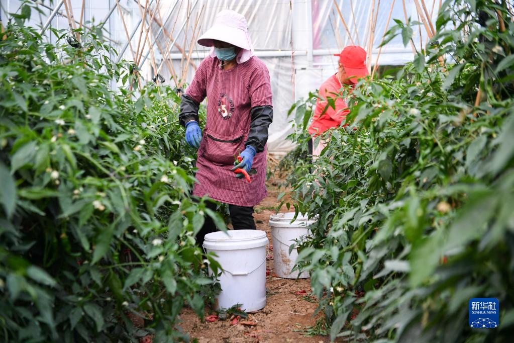 9月5日,工作人員在位于麟游縣九成宮鎮西坊村的農業示范園采摘辣椒。