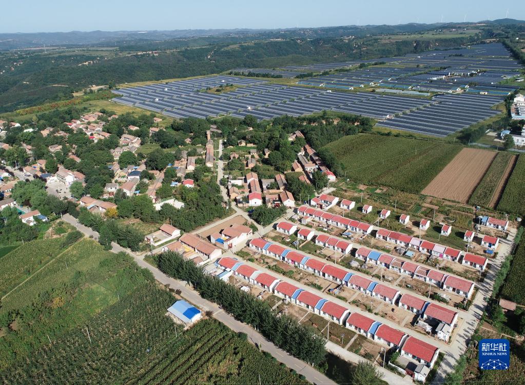 這是9月6日拍攝的麟游縣九成宮鎮豐塬村移民安置點,不遠處的光伏農業示范園可吸納移民搬遷群眾在家門口就業(無人機照片)。