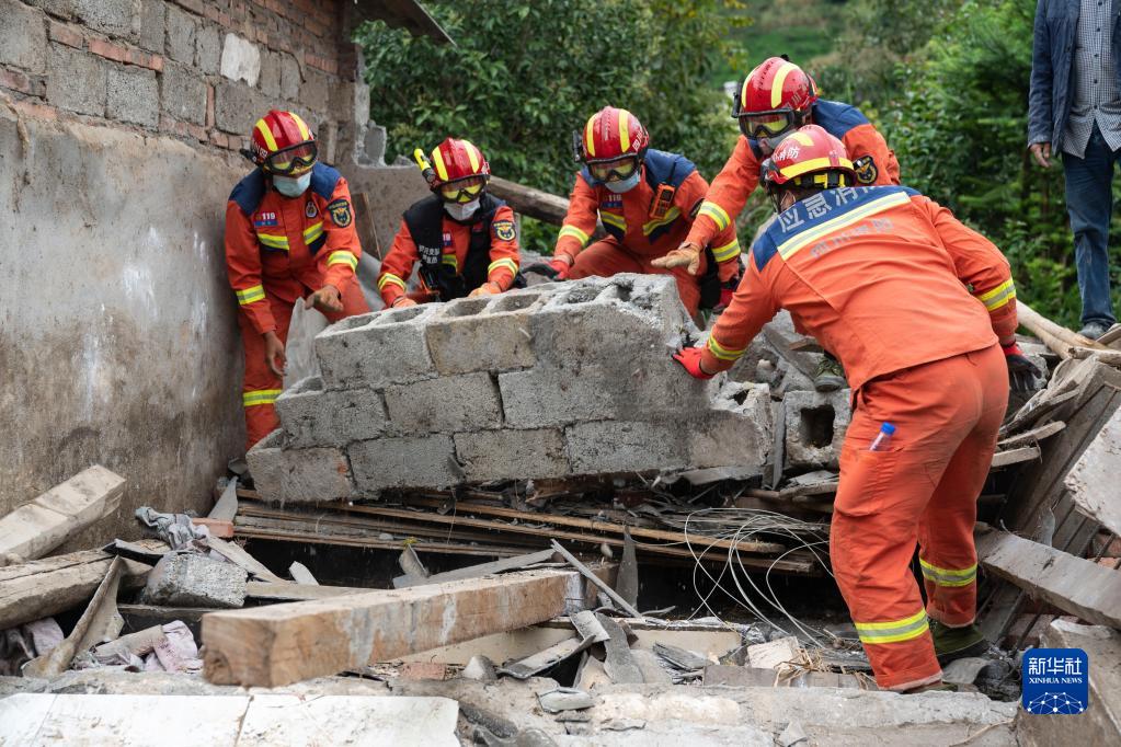 9月7日,在雅安市石棉縣王崗坪彝族藏族鄉幸福村二組,四川資陽消防救援隊員幫助村民清理廢墟。