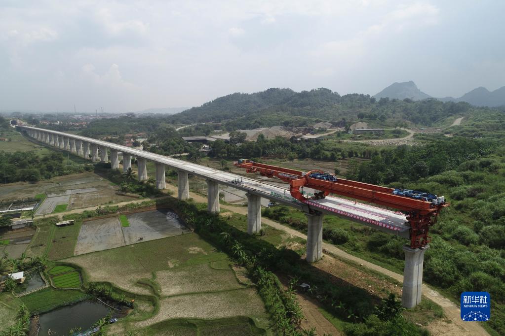 印尼雅萬高鐵4號梁場最后一榀箱梁7日精準落梁對位,提前8天完成全部1066榀箱梁預制和架設任務,為2023年6月建成通車奠定基礎。新華社發(王增堃 攝)
