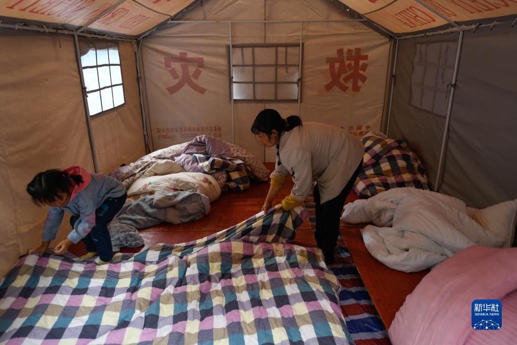 9月7日,石棉縣草科鄉的群眾在帳篷里整理床鋪。