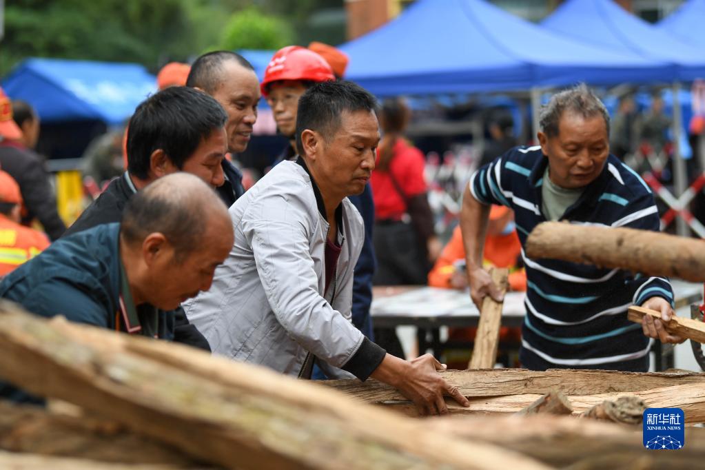 9月7日,在石棉縣草科鄉政府安置點內,當地群眾在搬運村民家中收集的柴火。