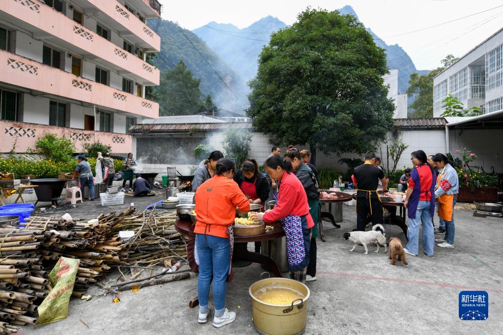 9月7日,在石棉縣草科鄉政府安置點內,當地群眾在準備午飯。