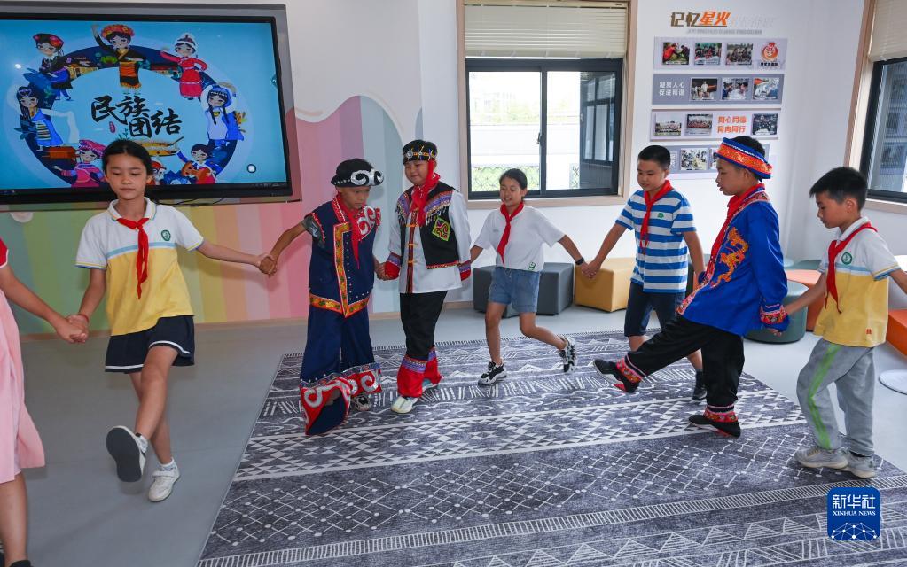 9月7日,多個民族的孩子們在東林鎮星火村參加迎中秋集體舞。