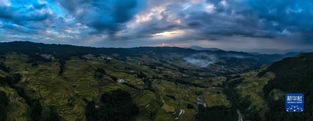 落日余暉下的哈尼梯田(無人機全景照片,9月7日攝)。