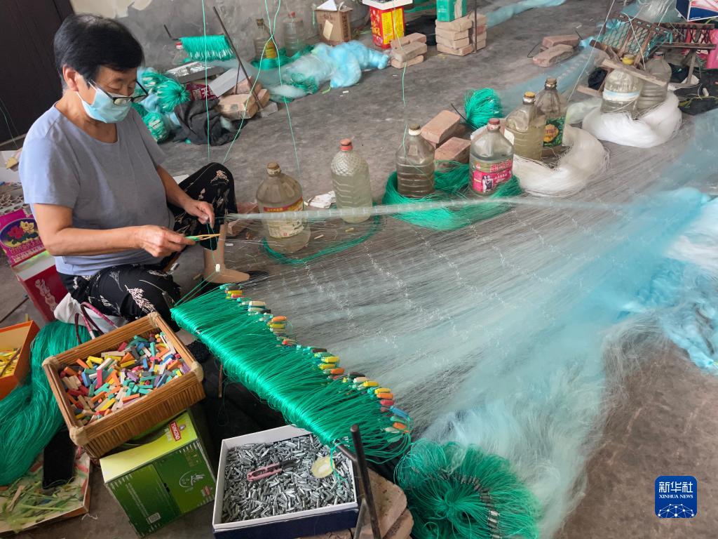 9月7日,無棣縣小泊頭鎮橋南王村村民在加工漁網。