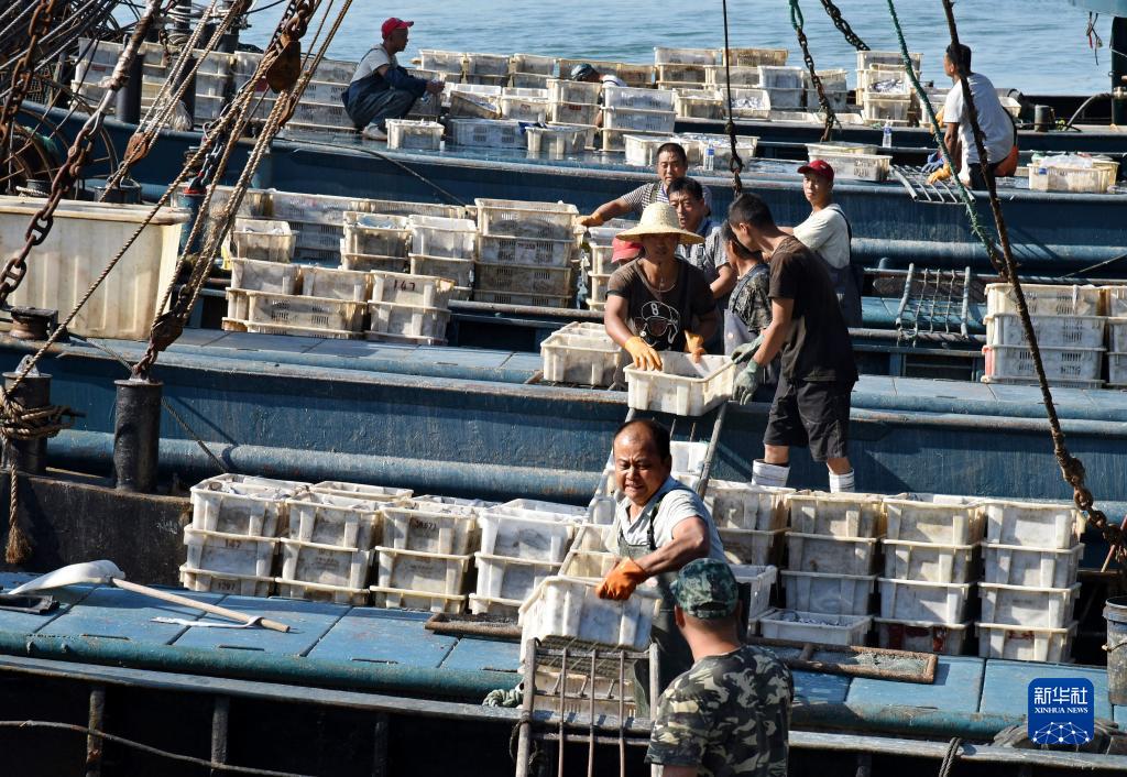 9月7日,在青島西海岸新區積米崖漁港碼頭,秋捕歸來的漁船紛紛靠港卸貨。 新華社記者 李紫恒 攝