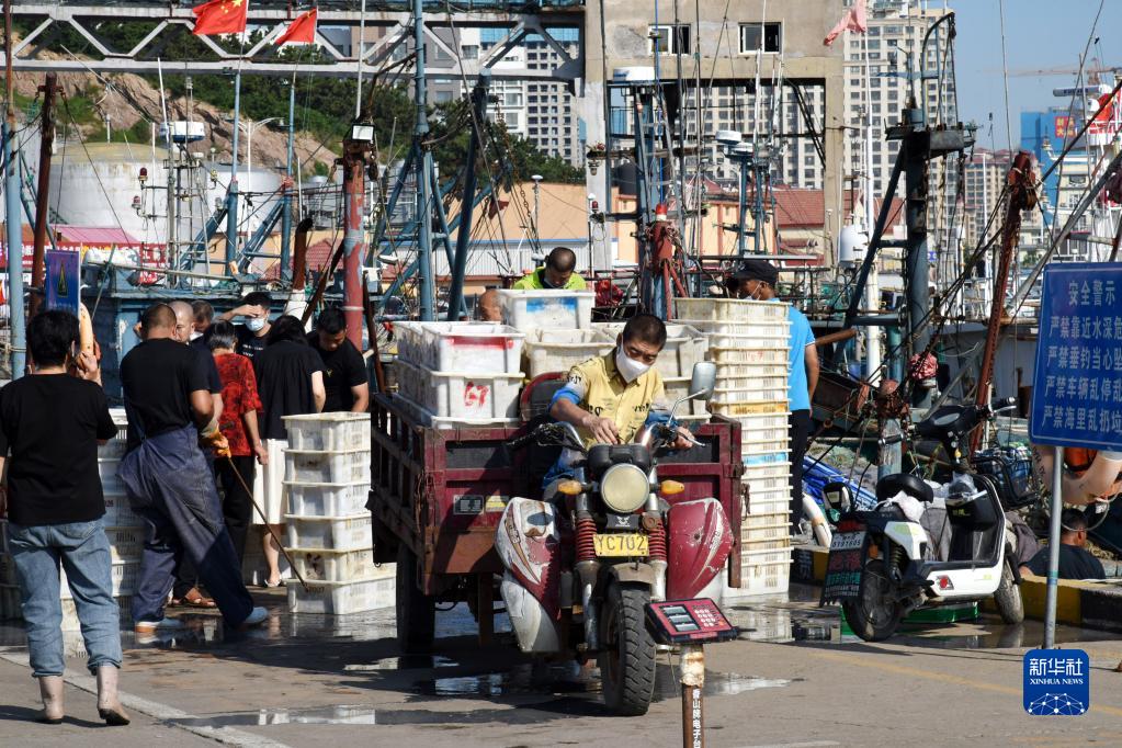 9月7日,在青島西海岸新區積米崖漁港碼頭,魚販在碼頭進貨選購。 新華社記者 李紫恒 攝