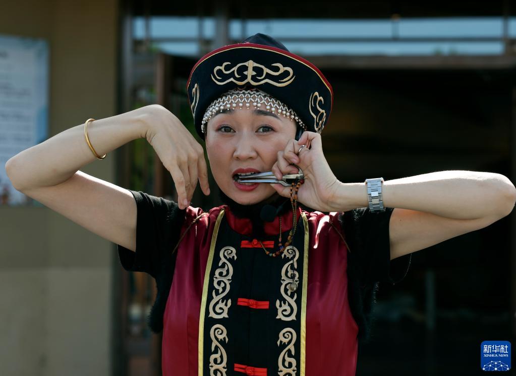 9月4日,在撫遠市烏蘇鎮抓吉赫哲族村赫哲民俗展示館,工作人員在表演口弦琴。