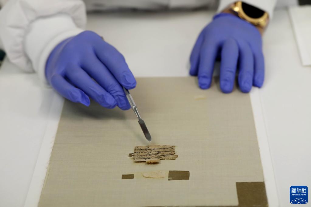 9月7日,在耶路撒冷,研究人員展示記錄古希伯來語信息的莎草紙信件碎片。