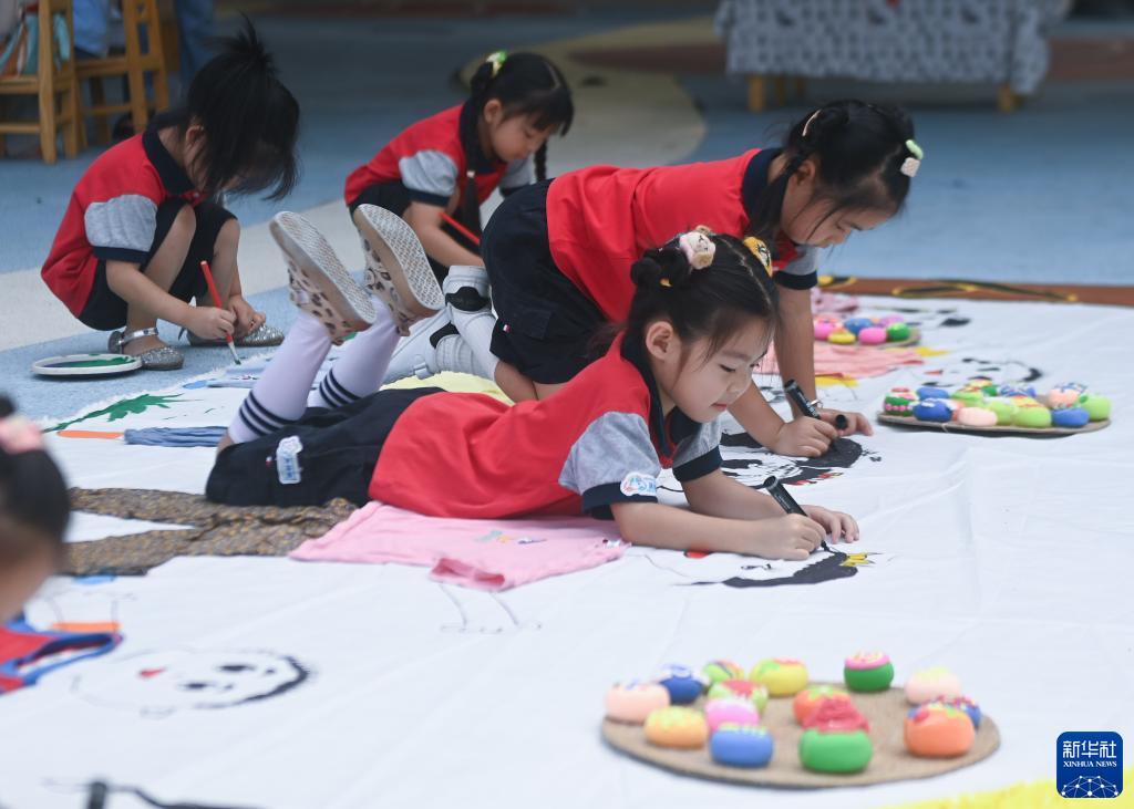9月8日,長橋中心幼兒園的孩子們在老師的帶領下用廢舊衣物等創作“月圓人團圓”環保創意畫。