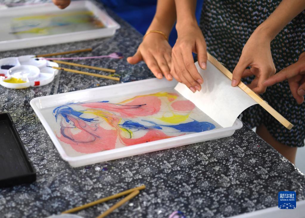 9月8日,在紙箋加工技藝傳習基地,愛好者在體驗流沙箋的制作工藝。