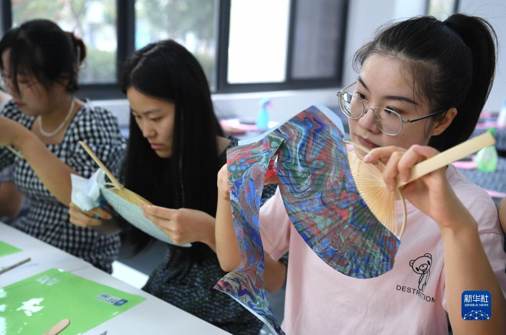 9月8日,在紙箋加工技藝傳習基地,愛好者體驗用流沙箋制作扇面。