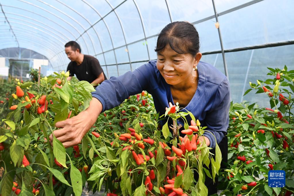 9月7日,陜西漢江之源農業開發有限公司員工在采摘大棚辣椒。