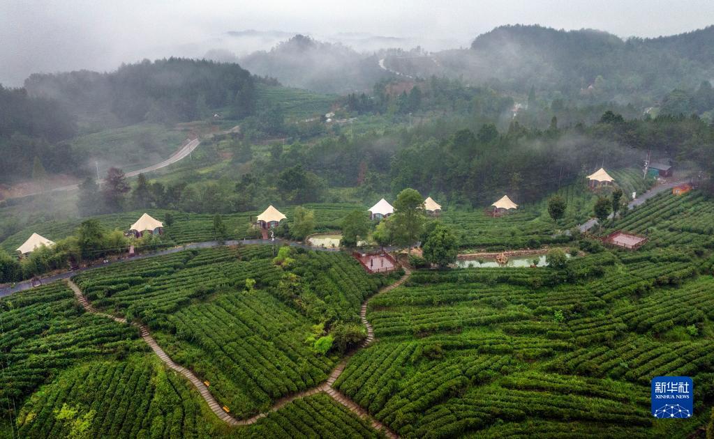 9月8日拍攝的云霧繚繞的寧強縣千山茶園景色(無人機照片)。