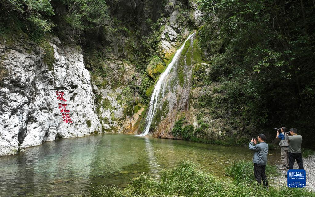 游客在位于寧強縣漢源街道漢水源村的漢江源頭拍照(9月6日攝)。此處原始森林、瀑布、碧潭、奇石、秀水交織,構成原生態自然風光景區。