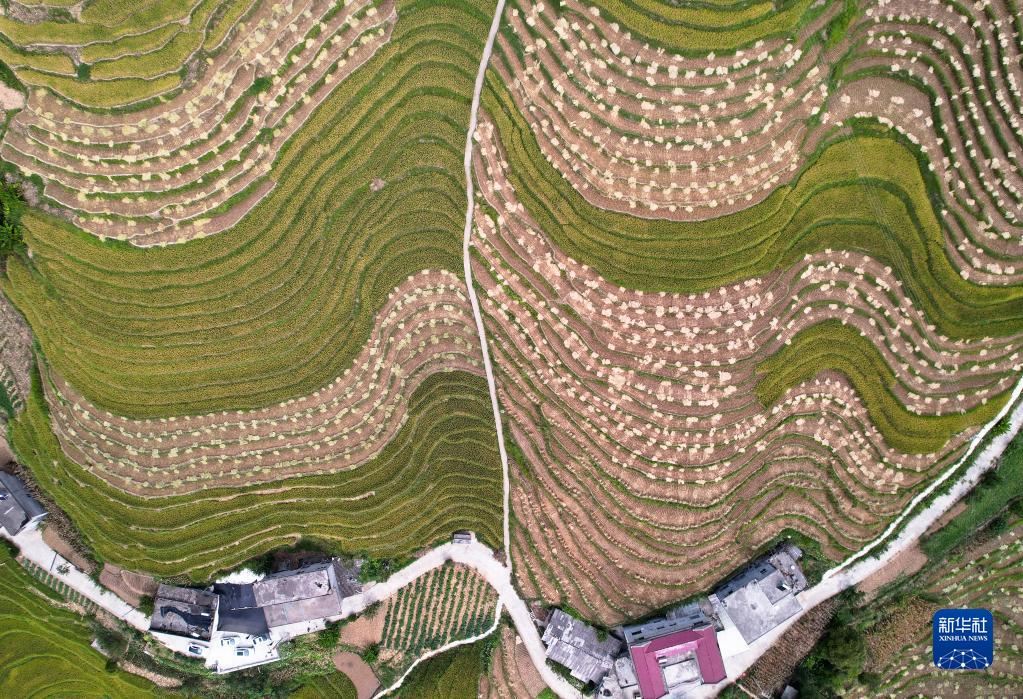水稻收獲中的嵐皋縣南宮山鎮桂花村古梯田(9月7日攝,無人機照片)。