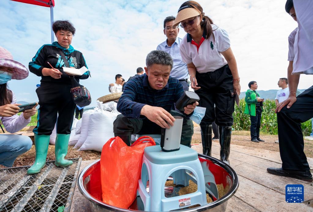 9月8日,工作人員在測產現場檢測“楚粳54號”稻谷水分。