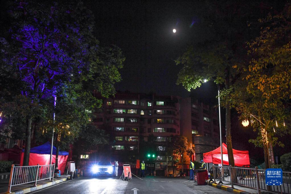 9月7日晚,在貴陽市云巖區大營路街道中天花園社區,物管人員和社區工作人員在疫情防控點值守。