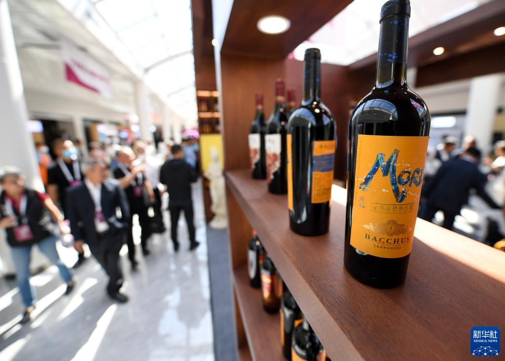 這是賀蘭山葡萄酒展銷會現場展示的寧夏葡萄酒(9月7日攝)。