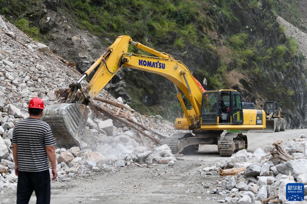 9月8日,石棉縣機械志愿者搶險隊在通往石棉縣草科鄉的道路上清理落石。