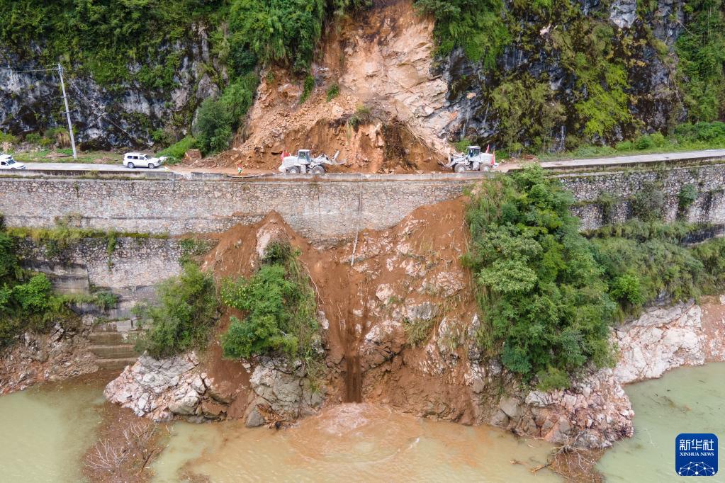 9月8日,四川路橋的工作人員搶修石棉縣與瀘定縣得妥鎮之間的道路(無人機照片)。