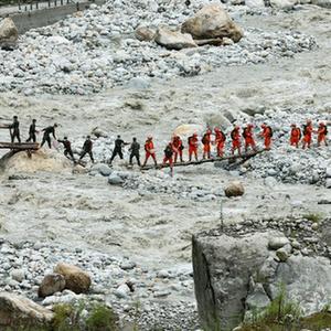 9月8日,在四川省甘孜州瀘定縣磨西鎮附近,救援人員站在臨時架設的小橋上向河對岸的村民運送生活物資。