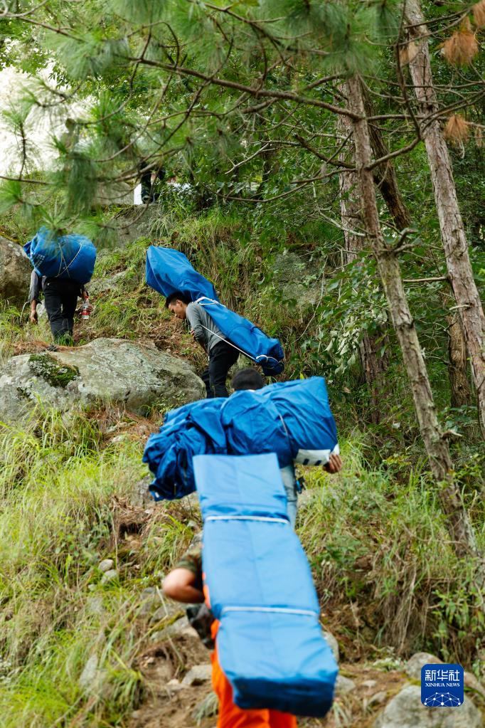 四川瀘定地震發生后,震中磨西鎮附近一些居住在山上的村民,因道路損毀未能全部撤出,只能在相對安全的開闊地帶搭建臨時安置帳篷。救援人員和志愿者沿著臨時架設的過河小橋和開辟出的上山小路,通過肩背人扛,把飲用水、帳篷等物資送上山,為山上臨時安置居民建立了一條供給線。