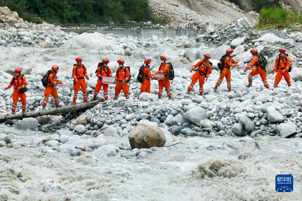 9月8日,在四川省甘孜州瀘定縣磨西鎮附近,救援人員站在臨時架設的小橋上向河對岸的村民運送生活物資。