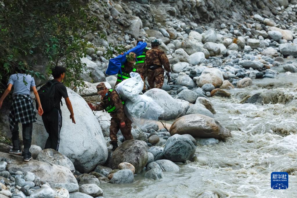 9月8日,在四川省甘孜州瀘定縣磨西鎮附近,救援人員沿著磨西河畔的上山小路運送救災帳篷等物資。
