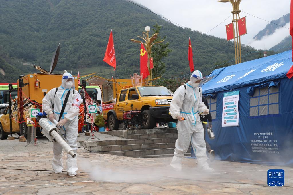 9月7日,武警四川總隊醫院醫護人員在瀘定縣磨西鎮貢嘎山王廣場開展環境消殺工作。新華社發(李華時 攝)