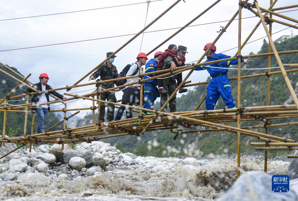 9月7日,武警四川總隊甘孜支隊官兵和地方救援隊在瀘定縣磨西鎮共和村利用剛建起的鋼架橋轉移受傷群眾。新華社發(段力新 攝)