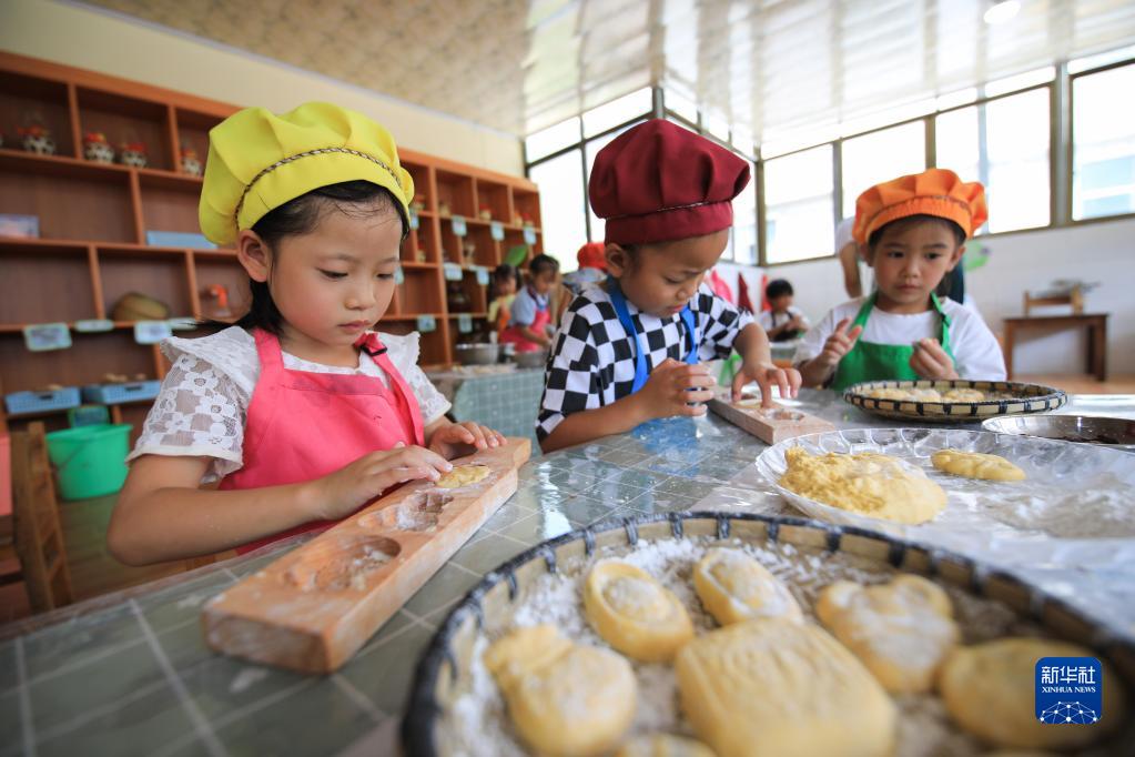 9月8日,貴州省黔東南苗族侗族自治州從江縣剛邊壯族鄉中心幼兒園的小朋友在學習制作月餅。