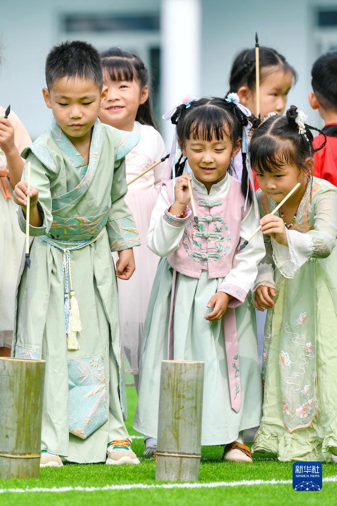 9月8日,浙江省湖州市長興縣煤山鎮中心幼兒園的小朋友在體驗投壺游戲。