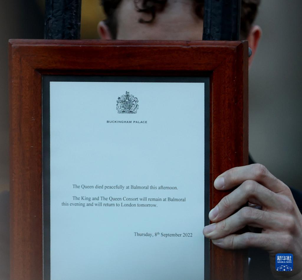 9月8日,在英國倫敦,工作人員將英國女王伊麗莎白二世去世的告示安放在白金漢宮大門上。